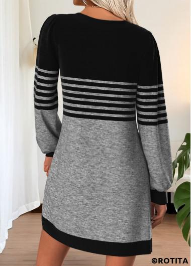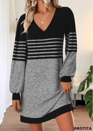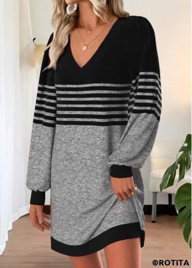 Home > Dresses/ ROTITA Tummy Coverage Striped Grey Short V Neck Dress