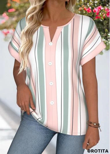 New In ROTITA Tummy Coverage Striped Multi Color Split Neck Blouse