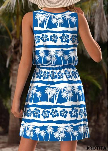 Home > Dresses/ ROTITA Tummy Coverage Tropical Plants Print Blue Short Sleeveless Dress