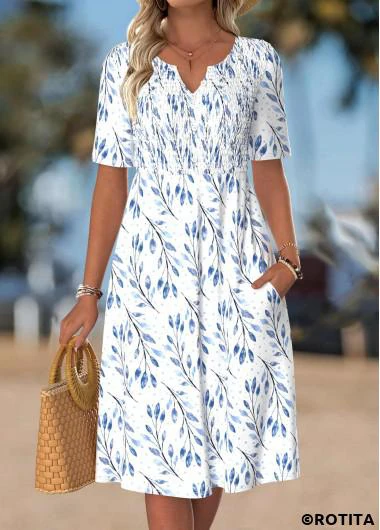 Home > Dresses/ ROTITA White Leaf Print Smocked Split Neck Short Sleeve Dress