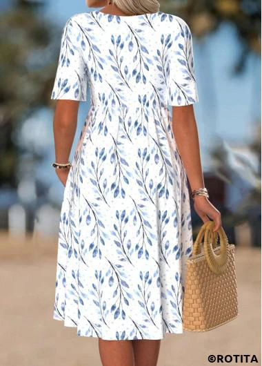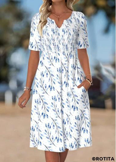 ROTITA White Leaf Print Smocked Split Neck Short Sleeve Dress