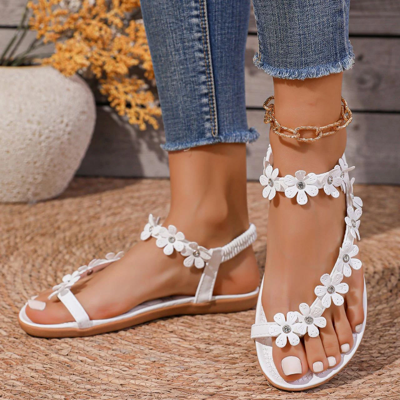 New In White Floral Falt Toe Post Sandals