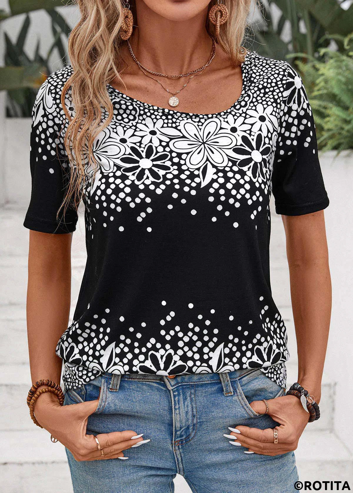 Sale Floral Print Black Asymmetrical Neck Short Sleeve T Shirt
