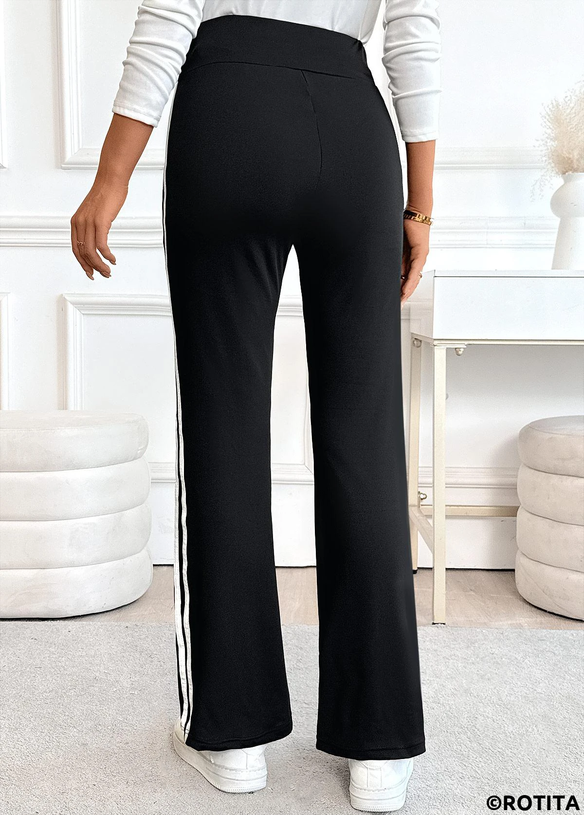 Striped Black Straight Leg Elastic Waist High Waisted Pants