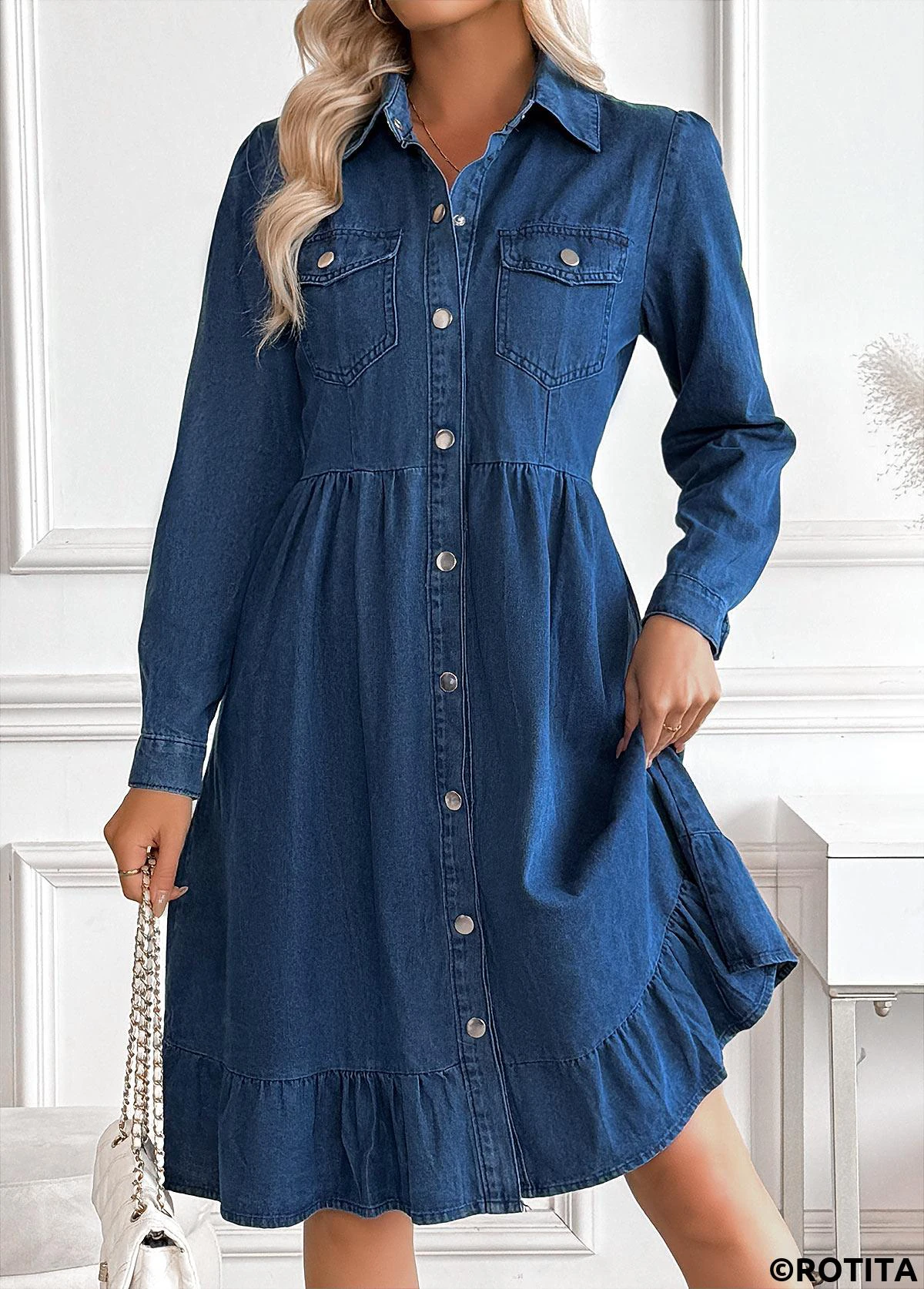 Home > Dresses/ Tummy Coverage Denim Blue Shirt Collar Long Sleeve Dress