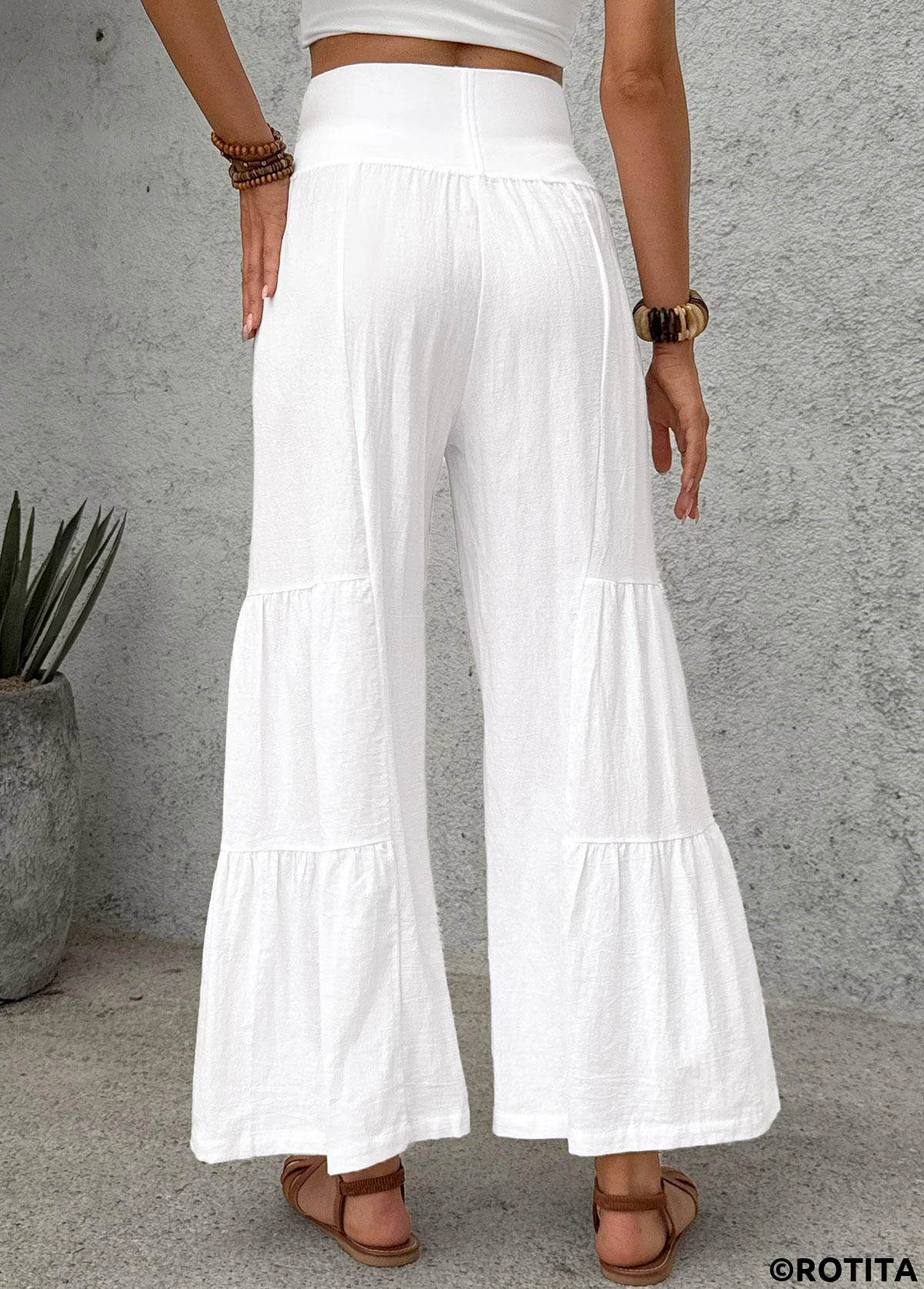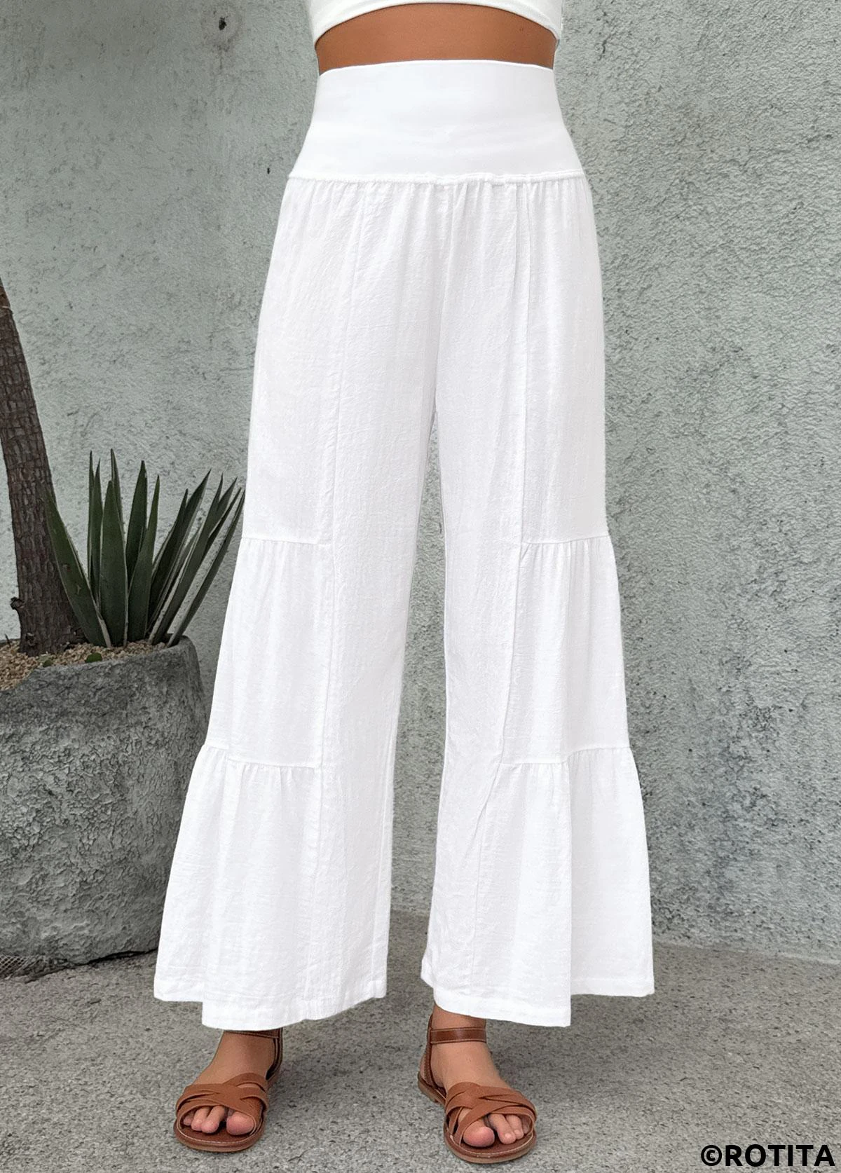 Sale White Wide Leg Elastic Waist High Waisted Pants